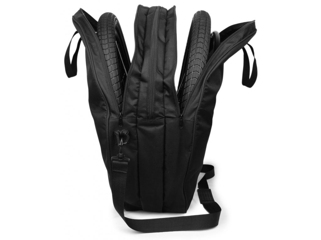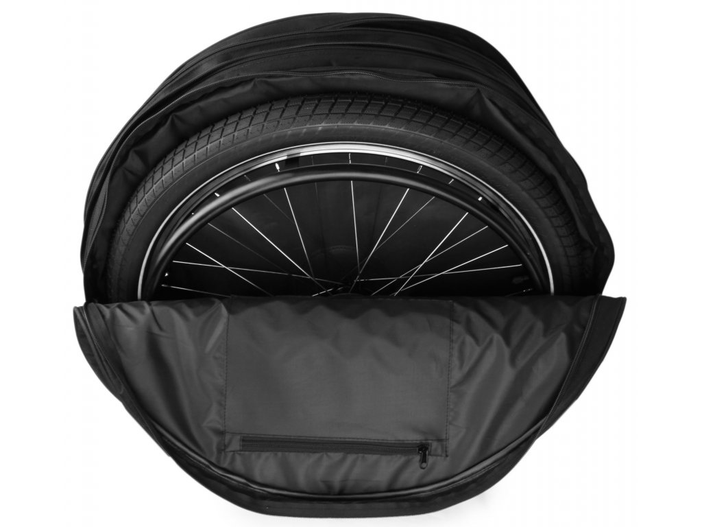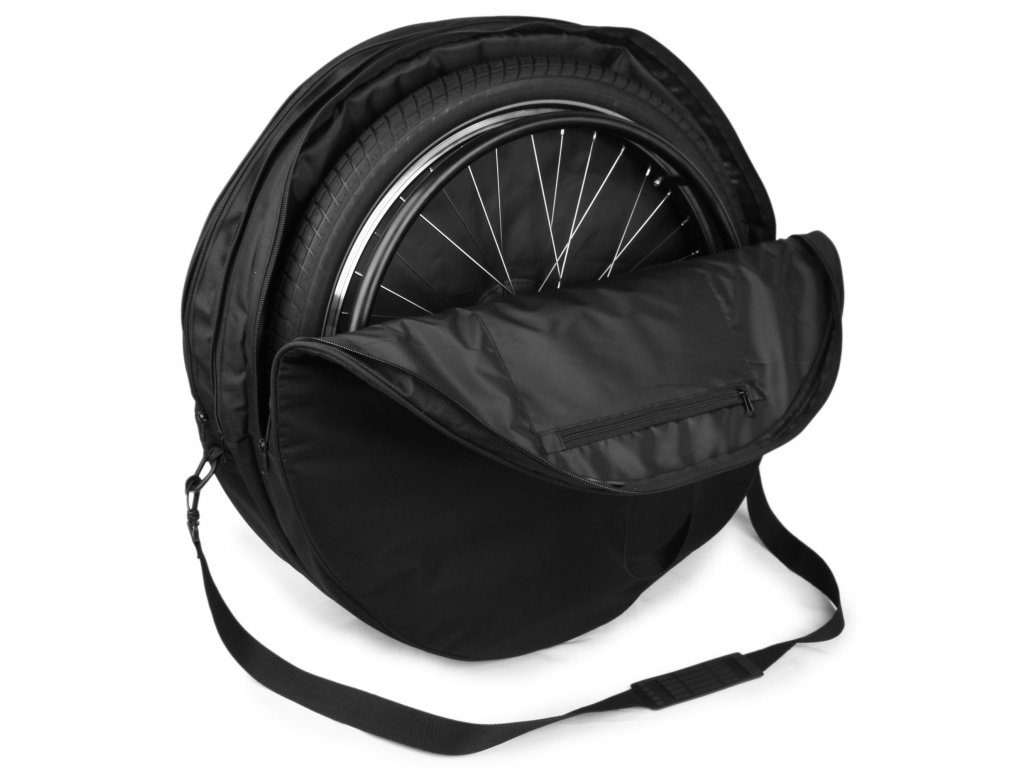 Tri samostatné priehradky pre kolesá vo veľkosti od 20" do 26", napr. pre súpravu kolies a rezervné koleso, popruhy na prenášanie, ramenný popruh a vnútorné vrecko na príslušenstvo, ako sú rýchloupínacie osky.
